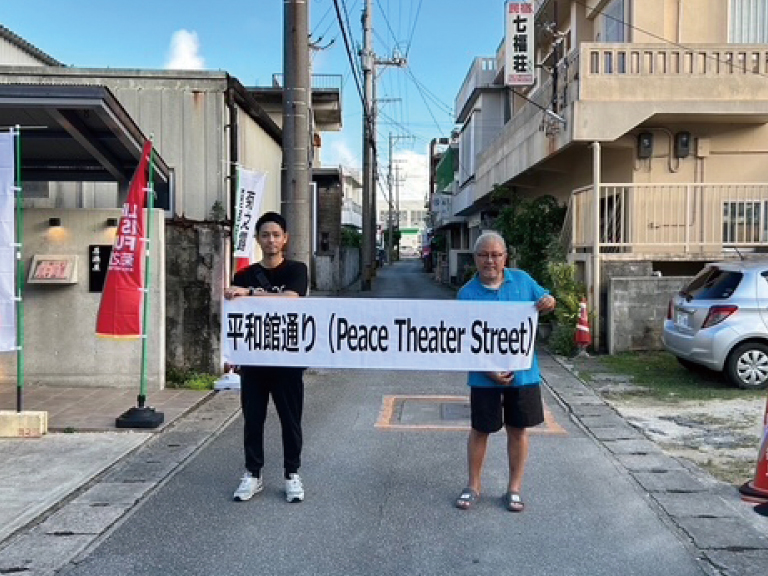 僕が子供の頃には「菊の露裏通り」、「そば通り」と呼ばれていました。戦後すぐには外国人将校クラブというアメリカの人達が集まるクラブがあり「将校通り」と呼ばれた時代もあるようです。昔を知る人が言うには沖縄市コザのミニ版のような通りだったみたいです。平和館という呼び名を残したいと会員で考え「平和館通り」と名付けました。インバウンドに対応するために「P・T・S(ピースシアターストリート」という略語も作りました。
